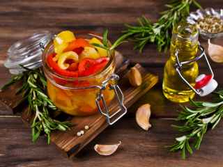 In saubere Twist-Off-Gläser schichten. Nach der halben Füllung eine Knoblauchzehe, ein Lorbeerblatt, etwas Gurkengewürz, Zwiebelscheiben einschichten, dann das Glas mit Paprika auffüllen. Die selbe Würze oben drüber geben.