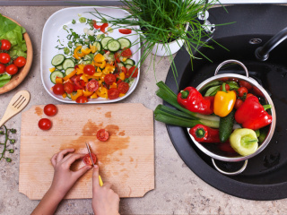 Zwiebel schälen und in feine Würfel schneiden. Tomaten vierteln, entkernen und in Würfel schneiden. Paprika vierteln, entkernen und würfeln. Gurken halbieren und in Scheiben schneiden. Koriander grob hacken. Knoblauch schälen und in sehr fein schneiden und mit Salz bestreuen. Ein paar Minuten und danach den Knoblauch mit einem Messerrücken zerreiben.