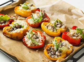 Diese Füllung passt auch sehr gut in Zucchini , Tomaten oder Auberginen. Diese Früchte jeweils aushöhlen das Fruchtfleisch zu den Zwiebeln geben und andünsten. Übriggebliebene Füllung können Sie auf dem Boden der Form verteilen und nach Belieben mit etwas Käse belegen.